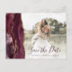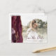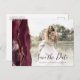 Cette élégante carte postale horizontale enregistrer la date dispose d'une bordure d'aquarelle bordeaux découpée avec une parties scintillant en faux or. Remplacez facilement l'exemple d'image par votre propre photo du futur marié et marié. Le texte personnalisable combine écriture manuscrite bordeaux foncé et police de cuivre ; un filtre en dégradé blanc aide à rendre le texte pop. Ajoutez votre adresse de retour et des détails supplémentaires au verso.
