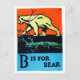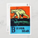 Charles Buckles Falls - B est pour Bear, woodcut, 1923. Page tirée d'un livre d'ABC en 1923, cette illustration colorée représente audacieusement un ours qui s'étend à quatre pattes au-delà d'une bille morte, avec un ciel orange et des reflets bleus. Fun Fact : Le carré noir dans le coin est la signature de l'artiste.