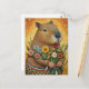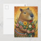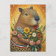 Une illustration amusante de style art folklorique d'un cabia avec un bouquet de fleurs, la carte postale parfaite pour un anniversaire et d'autres félicitations pour montrer votre amour à un amateur de rongeurs.