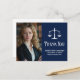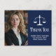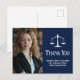 Élégantes cartes de remerciement d'avocat bleu marine avec la balance de la justice à côté de votre photo de remise de diplôme ou de cabinet. Personnalisez ces cartes de remerciement de faculté de droit avec une écriture blanche chic à côté de votre photo d'avocat.