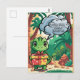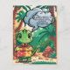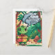 Un bébé dinosaure mignon offrant un cadeau à l'enfant qui fête son anniversaire dans une jungle préhistorique. C'est une charmante carte d'anniversaire pour les petits enfants qui aiment les créatures fantastiques et les dinosaures.