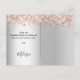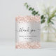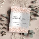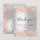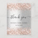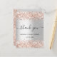 Une carte de remerciement pour une douche de mariée. Un fond métallisé argenté faux. Avec de la poussière de paillettes rose doré fausse. Sur le devant, un grand script lettrage à la main et le texte : Merci, votre texte, titre et une date.