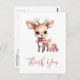 Carte de remerciement avec une illustration d'un adorable bébé cerf. Grands yeux grandes oreilles avec une grosse tête et de petites cornes brunes. Porte un grand nœud rouge. Se tient debout à côté d'une pile de cadeaux.