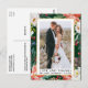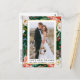 Élégant faire-part de remerciement de mariage avec fleurs hivernales aquarelles et verdure pour les mariés, comprenant poinsettias rouges, roses blanches, baies de houx et feuillage botanique. Cadre doré.