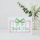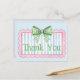 Cette carte de remerciement mignonne comporte un cadre rose avec des rayures bleues et blanches et surmonté d'un nœud en vichy vert et blanc. Personnalisez avec le texte spécial de votre choix.