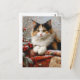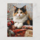 Carte postale représentant une peinture d'un beau chat calico sur une scène hivernale entourée de baies rouges, de pinèdes et de tissus douillets.