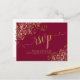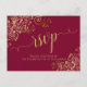 Ces magnifiques cartes-réponses RSVP de couleur rouge bordeaux ou burgundy faciliteront la réponse de vos invités à votre invitation de mariage. Elles présentent un design élégant avec une calligraphie script lace et de jolies volutes et boucles en faux-feuille d'or floral dans les coins. Le verso est un formulaire que vos invités doivent remplir et renvoyer en indiquant le nombre de participants et leur choix de repas. Il y a un espace pour entrer un site web afin que vos invités puissent répondre en ligne s'ils le préfèrent. Classiques et sophistiquées, ces cartes-réponses sont un merveilleux ajout à votre suite d'invitation.