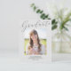 Cette carte de félicitations de fin d'études élégante comporte une calligraphie et une grande photo. Sur la face avant, « Diplômé » est inscrit en belle écriture calligraphique en haut, avec une grande photo ci-dessous. En bas, vous pouvez ajouter le nom du lauréat, l'école et l'année de la remise des diplômes. La typographie est gris charbon sur fond gris clair. Au verso de la carte, vous pouvez ajouter un message aux destinataires et/ou les informations sur la cérémonie de remise des diplômes.