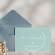Nouvelle carte de remerciement de mariage personnalisée et sophistiquée, avec citation "Love & thanks" en typographie calligraphique élégante avec des volutes, un petit cœur blanc et un cadre rond pointillé, sur fond vert sarcelle.
