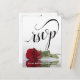 Cette carte de réponse RSVP présente un design élégant avec le titre rsvp écrit en belle calligraphie, et une seule rose rouge posée sur le côté se reflétant dans un bassin d'eau. Romantique, sophistiqué et chic. Le verso est un formulaire pour que vos invités remplissent soit en acceptant, soit en envoyant leurs regrets. Il y a un espace pour qu'ils choisissent quel repas ils préfèrent et indiquent le nombre total d'invités dans leur groupe. Il y a également un espace pour entrer un site web afin que vos invités puissent répondre en ligne.
