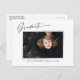 Cartes postales de faire-part photo tendance, moderne et élégant, avec éléments design de texte moderne avec script d'encre de calligraphie. La photo du diplômé sur le devant de la carte est habillée d'un délicat et minimaliste dégradé. Le dos de la carte offre des espaces de texte personnalisés pour des informations sur votre diplôme ou peut être effacé si vous souhaitez écrire un message à la main. Noir et blanc ou customiser facilement l'arrière - plan pour correspondre à la couleur primaire de votre école ou à n'importe quelle couleur de votre choix. Idéal pour les étudiants du secondaire, collégial et universitaire.