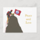Un alpiniste au design "symbole de paix" au bord d'une haute montagne. Une belle carte postale paisible avec le texte "paix et amour". Pour la paix du monde ou pour désirer de bonnes vibrations à celle que vous aimez et respectez.