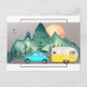 Aquarelle illustration d'une petite voiture avec une remorque vintage accrochée devant une forêt avec coucher de soleil. Linnaea Mallette