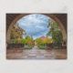 L'image montre une cour de l'université de Stanford, vue à travers une arcade en pierre. La cour est ornée d'un motif à damiers de carreaux de pierre, avec des tables de pique-nique en bois et des bancs éparpillés autour. Des arbres aux feuillages d'automne dans les tons verts, jaunes et oranges entourent la cour.
