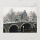 Carte postale photo d'un canal avec un pont, des maisons traditionnelles et des vélos sous la neige en hiver dans la capitale néerlandaise, Amsterdam, Pays-Bas avec une barre noire qui s'estompe et le texte 'Amsterdam'.
