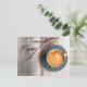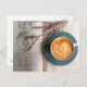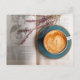 Cappuccino sur une soucoupe bleue sur le dessus d'un livre de fleurs illustré avec une herbe violette.