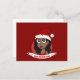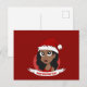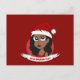 Carte postale avec illustration de la belle jeune femme afro-américaine aux cheveux ondulés et casquette du Père Noël ; avec modèle texte modifiable, conception de vacances de Noël avec un arrière - plan rouge