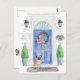 Annoncez votre nouvelle adresse grâce à notre faire-part élégante avec un Carlin, une porte d'entrée bleue, un tapis de bienvenue, une ardoise, des topiaires et une couronne fleurie posée sur un arrière - plan en brique grise.