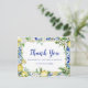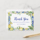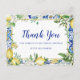 Une charmante carte de remerciement qui présente une bordure de carrelage mosaïque bleu avec un mince cadre doré au centre. Les citrons, les fleurs blanches et les feuilles vert sauge s'entremêlent pour créer une ambiance botanique moderne. Merci est écrit dans une jolie calligraphie moderne. Votre nom est en dessous dans un texte élégant.