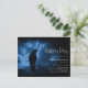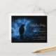 Carton d'invitation d'anniversaire avec une image d'un corbeau noir la nuit perché sur une branche d'arbre avec des runes au-dessus qui dit "corbeau noir". Ambiance sombre et mystérieuse.