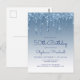 Cette carte postale d'invitation pour un 50e anniversaire tendance présente une bordure scintillante à gouttes de paillettes bleues et un fond ombré. Les mots "50e Anniversaire" et le nom de l'invité d'honneur apparaissent dans une écriture manuscrite bleue décontractée, tandis que le reste du texte personnalisable est dans une police sans serif bleue. (REMARQUE : les enveloppes ne sont pas incluses automatiquement avec cette invitation économique. Pour ajouter des enveloppes à votre commande, veuillez utiliser le menu déroulant "Enveloppes".)