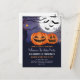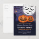 Carte postale d'invitation pour une fête d'anniversaire Halloween avec Jack O'Lantern effrayant. Invitations de fête personnalisées pour enfants avec des citrouilles de Jack O'lantern effrayantes et des chauves-souris sur la lune. Modèle facile à utiliser pour ajouter vos détails de fête.
