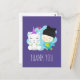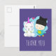 carte postale Merci avec une image lunatique d'une licorne et d'un oiseau. Cette paire est heureuse de sourire pendant qu'elle traîne ensemble. Un petit coeur flotte au-dessus de leur tête. La licorne est blanche avec des ailes d'anges et une corne rose. L'oiseau est d'une couleur bleu verdâtre portant une toque noire avec un chat kitty noir avec des oreilles. Un nuage bleu placé derrière ces heureux meilleurs amis.