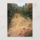 Une cascade d'eau boueuse plonge sur les rochers parmi les arbres de l'automne.