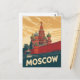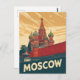Cette carte design présente une illustration de style vintage de l'emblématique cathédrale Saint-Basile de Moscou, en Russie. Le design capte les dômes colorés uniques et les murs de la forteresse classique avec une texture rétro et en détresse. La palette de couleurs feutrées et la typographie "MOSCOU" audacieuse et affligée lui donnent l'air d'une affiche de voyage classique. C'est le souvenir ou l'accueil parfait pour tout amateur de voyage, d'histoire ou d'architecture unique.