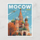 Une affiche de voyage vintage et vibrante représentant l'emblématique cathédrale Saint-Basile de Moscou, en Russie. L'illustration met en valeur les célèbres dômes colorés et l'architecture unique de la cathédrale sur un ciel bleu clair avec un avion volant au-dessus, laissant une traînée. Ce design rétro est parfait pour ceux qui aiment les voyages en Europe, les monuments historiques ou la riche culture de la Russie. Il évoque un sentiment d'aventure et d'émerveillement, ce qui en fait une pièce d'art idéale pour n'importe quel espace.