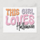 Ce design ludique et coloré présente la phrase « Cette fille adore Halloween » en caractères gras de style rétro. Le texte est divisé en trois lignes, chaque ligne ayant une palette de couleurs distincte. Le mot « CETTE » est dans une orange douce et texturée, « FILLE » dans un violet pastel et « ADORE » dans un rose clair de bubble gum. Le mot « Halloween » est écrit en cursive noire lisse, ajoutant du contraste et de l'équilibre au design. Chaque lettre a une forme légèrement arrondie et bubbly, donnant au design une sensation amusante et fantaisiste, parfaite pour célébrer l'esprit festif et léger d'Halloween.