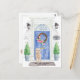 Annoncez votre nouvelle adresse avec notre faire-part élégante avec un cockapoo au champagne, une porte d'entrée bleue, un tapis de bienvenue, une ardoise, des topiaires et une couronne fleurie posée sur un arrière - plan en brique grise.