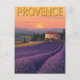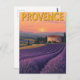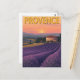 Cette belle carte présente une illustration vintage des champs de lavande de Provence, France, au coucher du soleil. Le design saisit une scène classique d'un bâtiment en pierre traditionnel niché au milieu de lignes violettes vibrantes, avec des cyprès et des collines dans l'arrière - plan. La lumière chaude et dorée et la typographie rétro lui donnent l'air d'une affiche de voyage intemporelle. C'est la carte idéale pour un billet de voyage ou un cadeau pour un amoureux de la nature et de l'art.