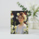 Carte postale d'art avec le tableau de Charles Courtney Curran (1861-1942), artiste impressionniste américain, intitulé Among the Hollyhocks (1904). Portrait d'une jeune femme en robe blanche aux cheveux auburn entourée de fleurs de jarret jaunes et rouges.