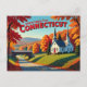 Une scène d'automne pittoresque dans le Connecticut avec une église blanche classique, un pont couvert et un feuillage vibrant — parfait pour les cadeaux de saison et le courrier sincère.