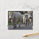 Une carte postale avec un troupeau de Charolais marchant le long de la route près de l'appareil photo et en regardant l'appareil.