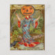 Cette femme est prête pour une fête d'Halloween. Cet imprimé vintage d'Halloween représente une femme avec une lanterne de valet. Une chauve-souris et une bougie sont au premier plan.