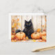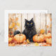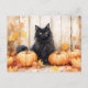 Aquarelle d'un chat noir moelleux aux yeux ambrés et brillants assis parmi les citrouilles et des feuilles d'automne éparpillées.