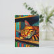 Chat de dessin animé de style bande dessinée dormant sur une étagère de livres. Une carte postale mignonne pour garder contact.