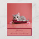 Un mignon chat tabby en caricature gris et blanc pond sur un coussin couleur grenat avec oeillets roses à proximité.