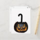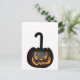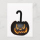 Les yeux verts d'un chat noir regardent d'un citrouille noir et orange avec sa queue en haut de la carte postale photo Halloween