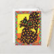Ce joyeux chat noir est décoré de nombreuses formes colorées qui rappellent celles que l'on retrouve sur les sculptures animales d'Oaxacan. Elle est assise sur une surface orange vif contre un arrière - plan jaune vif. Toute la scène est entourée d'une frontière festive de style mexicain.