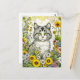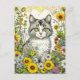 Carte Postale Chat kitty gris et blanc assis en fleurs