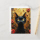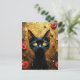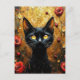 Un mignon chat noir avec de grands yeux jaunes et des roses rouges sur un fond tacheté or et brun