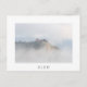 Carte postale du château historique de Bled, construit sur les rochers le long du lac Bled, entouré de nuages et de brouillard terrestre, comme c'est un château construit dans le ciel, à Bled, Slovénie avec une frontière blanche et le texte 'Bled'.