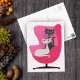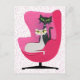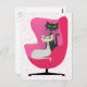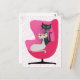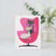 Cette carte postale présente deux chats atomiques du milieu du siècle, un blanc, un noir avec des colliers en diamant assis dans une chaise rose sur fond blanc avec des points roses.