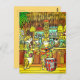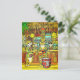 Carte postale dans une illustration à thème tropical représentant des chats dans un tiki bar. Habillé de chemises hawaïennes vibrantes, un chat joue un ukulèle et se tient près d'un tambour rouge, tandis que d'autres sirotent des cocktails. Le bar propose un décor de bambou, des masques de tiki et des frondes de palmiers pour une ambiance festive et insulaire.