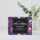 Invitation à une fête d'anniversaire Halloween avec un motif adorable sur le thème d'Halloween. Des chats avec des chapeaux de sorcières, assis sur des citrouilles roses avec des toiles d'araignées violettes en arrière-plan.