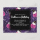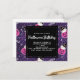 Invitation à une fête d'anniversaire Halloween avec un motif adorable sur le thème d'Halloween. Chats avec des chapeaux de sorcières, assis sur des citrouilles roses avec des toiles d'araignées violettes en arrière-plan.