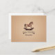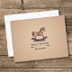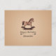 Une carte d'anniversaire avec un fond beige dégradé et texturé et une illustration d'un cheval à bascule artisanal aux tons bruns : un beau cadeau pour un enfant ou un amateur de jouets en bois !